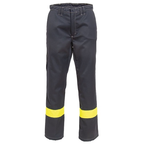 Flame Retardant trousers with offset side seams and double fabric in front for extra protection against heat. The trousers are made of a strong and flexible satin customised for work with zinc and chemicals.